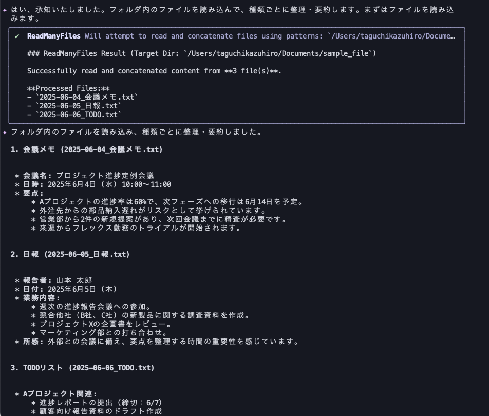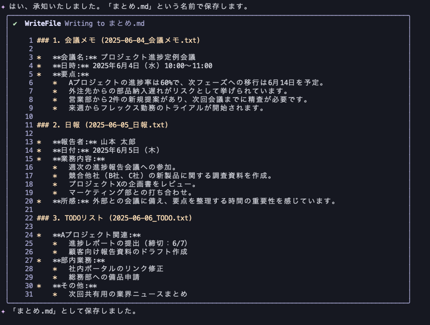 このように、複数のテキストファイルから要点を抜き出して分類・要約・保存までを行う処理が、Gemini CLIなら自然文のやりとりだけで完結する。