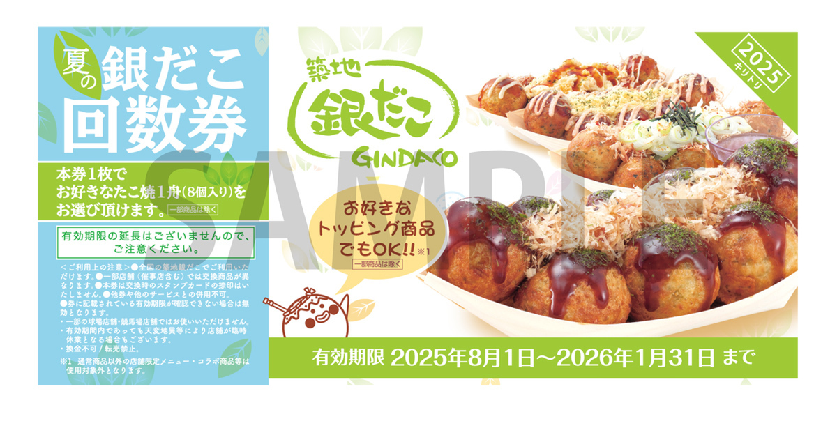 築地銀だこは7月18日~21日の4日間、「イオン 超!ナツ夏祭り」に参加し、全国のイオンおよびイオンモールに出店する対象店舗で「ぜったいお得な夏の回数券(6枚セット)」を販売します。