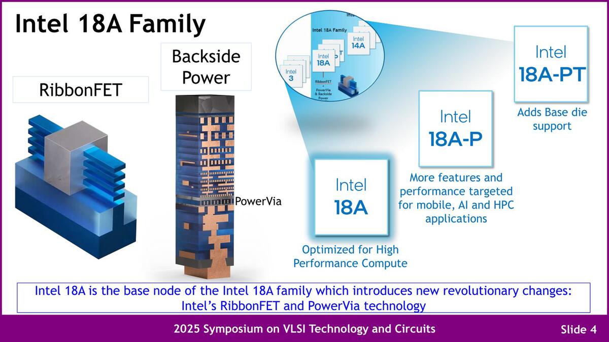 まずIntel 18Aには複数の派生型があるという話は以前のロードマップでも出ていたが、基本となるのがIntel 18Aで、Intel 18A-Pはその性能改良型、そこにFoveros Direct 3D対応を追加したのがIntel 18A-PTという形になる。ちなみにRibbonFETとPowerVIAことBSPDNはIntel 18Aで標準搭載される技術となる。