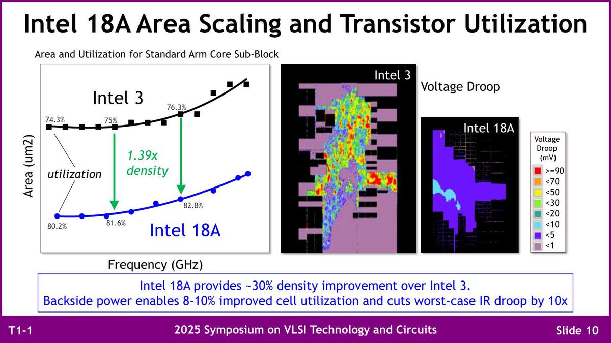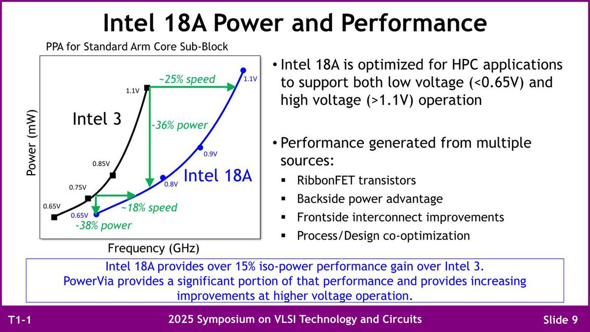 4月における説明では、Perf/WがIntel 3と比較して15%以上向上するという話であったが、0.65V付近でも18%、1.1Vでは25%の動作周波数向上が期待でき、逆に動作周波数一定なら36~38%の消費電力削減が期待できるというなかなかの優れものであるとされる。