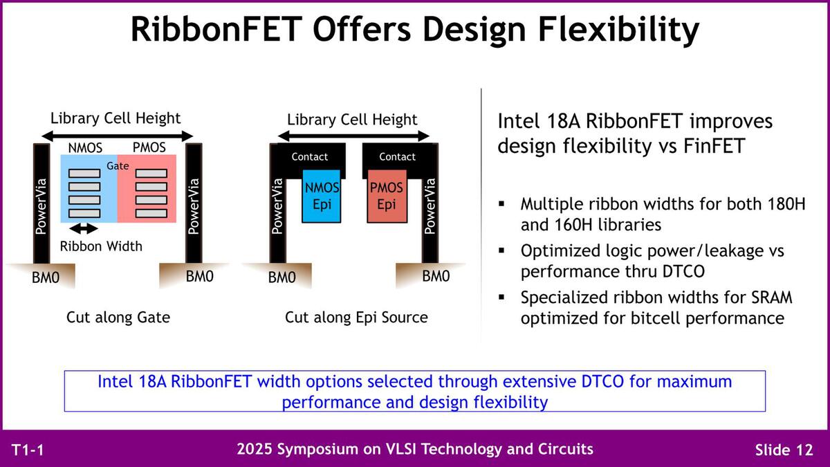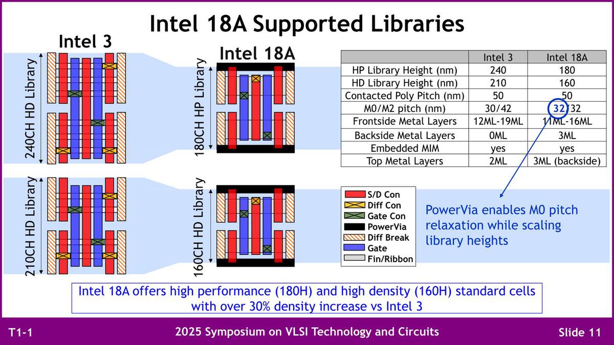 なぜこれが可能かと言えば、Intel 4/3ではFinの数を増やして特性を変えている(上の画像でHPはFinが3つ、HCはFinが2つ)のに対し、Intel 18AではRibbonをZ軸方向に積み重ねて特性を変えている(ついでにRibbonの幅も変えている)から、結果としてFinFET世代よりCell Libraryを小型化できることに起因する。逆に言えば、配線密度そのものはIntel 4/3世代と大きく変わらないこともここから明らかになった格好だ。