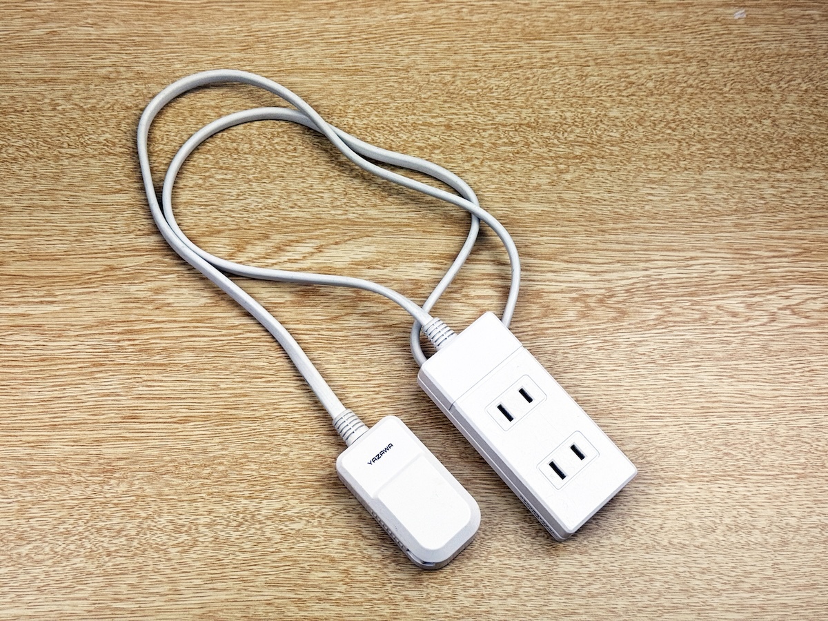 さらにタップ側は3個口になっているので、複数の機器が装着可能。ケーブル部分は約1メートルで、使用したい場所からコンセントが離れていても使いやすい。製品自体も240Vまで対応の設計なので、電圧の違う海外でも安心して使えます。