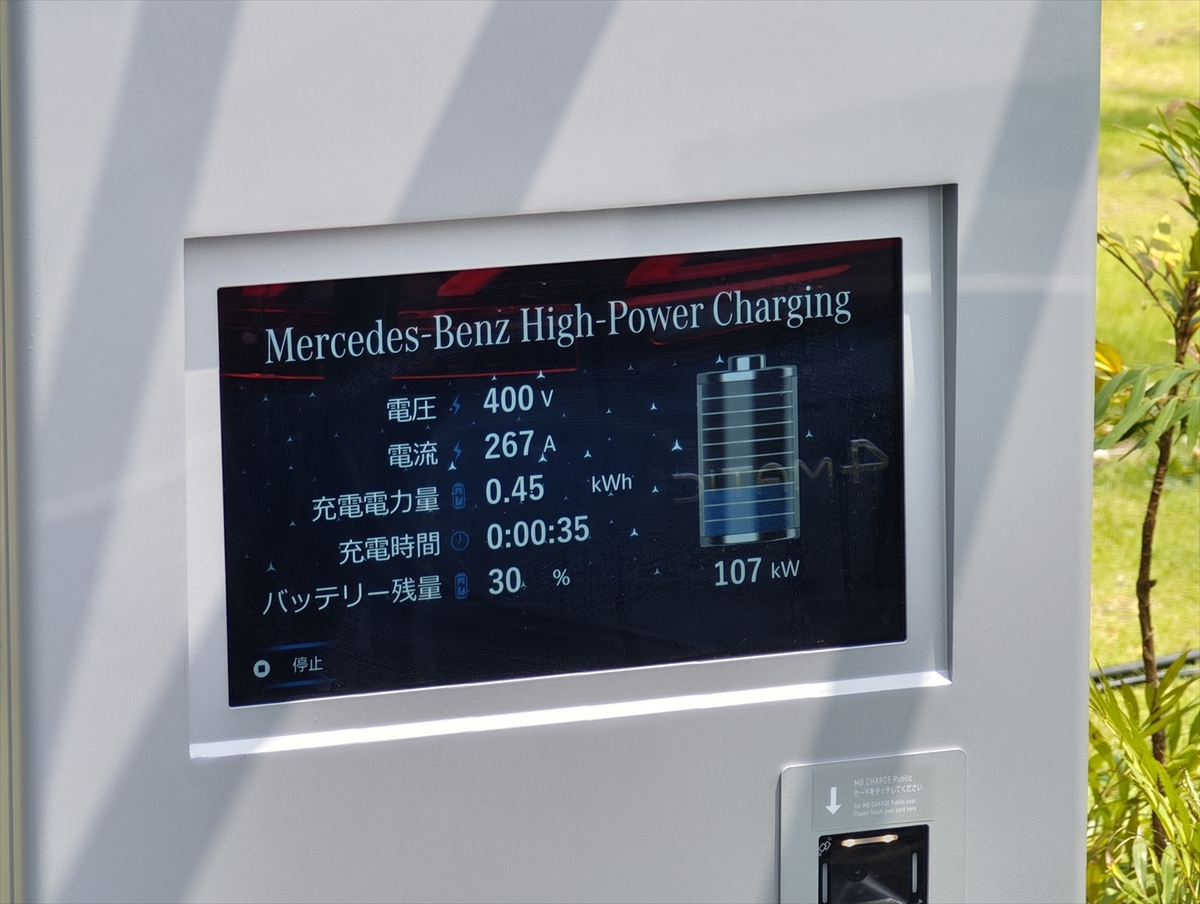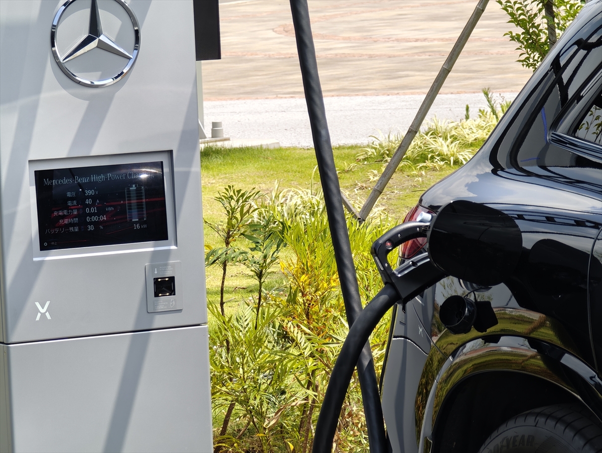 1回の充電は最大30分です。メルセデス・ベンツ日本合同会社のゲルティンガー社長によると、約30分で電池残量20%から60%程度まで、約1時間で20%から80%近くまで充電が可能だそうです。充電サービスの電力は、2025年末までに実質再生可能エネルギー100%として提供することを目指しています。