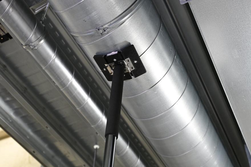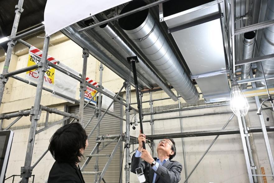 もう1つ作ったのは、現場にカメラを設置するための専用治具だ。自撮り棒のようなカメラ装着用の治具は強力な磁石を使って建設現場の天井デッキや鉄製建具、配管などに取り付けられる。しかも、先端が三枚の磁石パネルで構成されているので、平面の鉄板のみならず、ダクトのような曲面にも取り付けられる。「設置場所を現地で簡単に変えられないと、使ってもらえない。いろんなデッキで使えて、付け替えが簡単で、職人さんに嫌われないものを開発してほしいと樫本君にリクエストしました」と松﨑氏は語る。