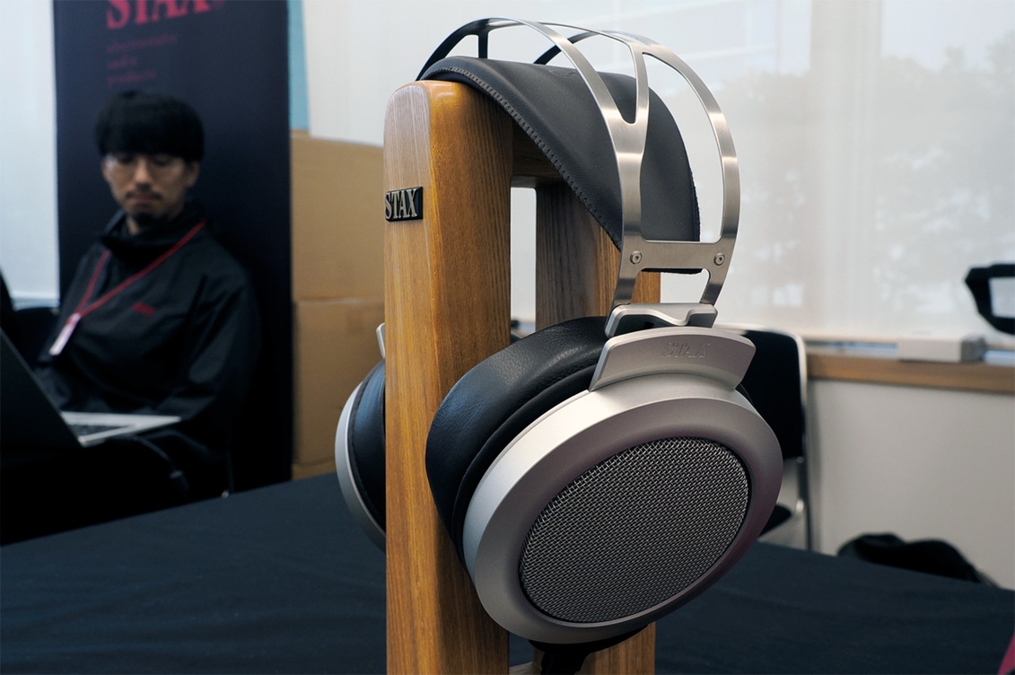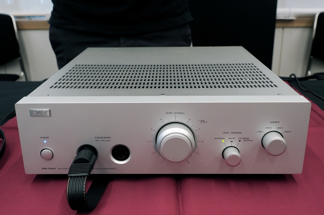 静電型ヘッドホンの老舗STAX(スタックス)から6月30日に発売されたばかりの「SR-007S」をハイエンドのドライバーユニット「SRM-T8000」で試聴するシステムが組まれた。ドライバーユニットには専用オプションのUSB DACモジュール「UIM-1」が装着済である。