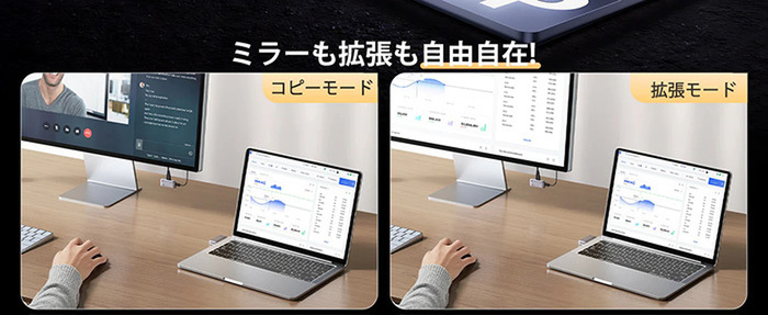 複製モードや拡張モードを活用することで、オフィスワークや在宅勤務の効率を大幅に向上。マルチタスクもスムーズにこなせます。