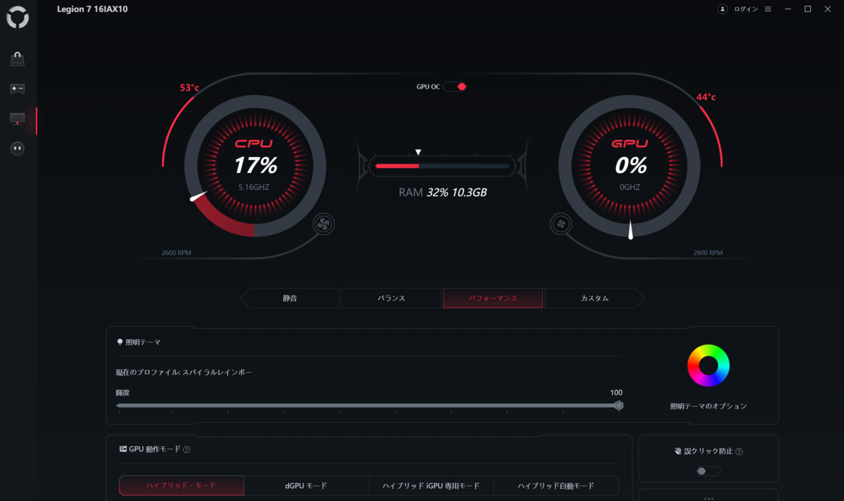 また、冷却ファンの動作モードや、GPU切り替え(MUXスイッチ)の設定、有機ELパネル向けの焼き付き防止機能などもここから操作可能。さらに、キーボードのRGBライティングのカスタマイズも簡単に行え、自分好みにPCの雰囲気を整えることができます。