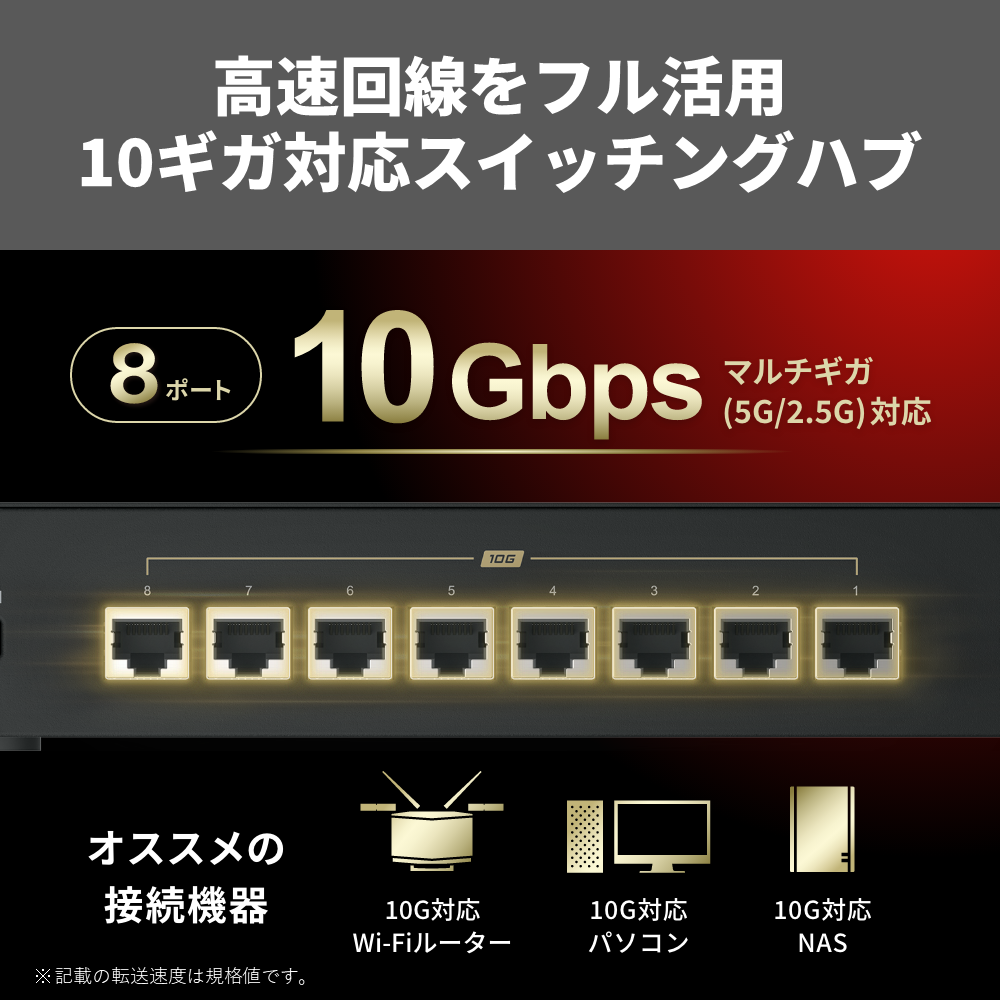 LXW-10G8は、全ポートが10Gbpsに対応し、家庭でも高品質なネットワーク構築を可能にするスイッチングハブだ。最大8ポートを備え、10GBASE-Tや5GBASE-T、2.5GBASE-T対応のデバイスに幅広く接続できるのが大きな特徴となっている。