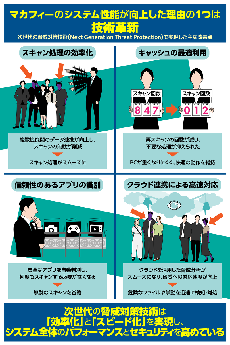 近年、マカフィー製品のシステム性能は大幅に向上しています。その要因の1つに挙げられるのが「次世代の脅威対策技術(Next Generation Threat Protection)」への移行です。マカフィーはこの技術革新により、おもに以下のような改善が実現していると語っています。