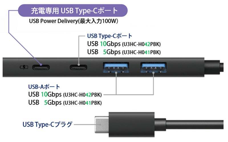 両モデルの違いはデータ転送速度にある。USB 10Gbpsモデル「U3HC-H042PBK」は、大容量の動画データを扱うのに適している。一方、USB 5Gbpsモデル「U3HC-H041PBK」は、文章や写真などのファイル転送に最適だという。