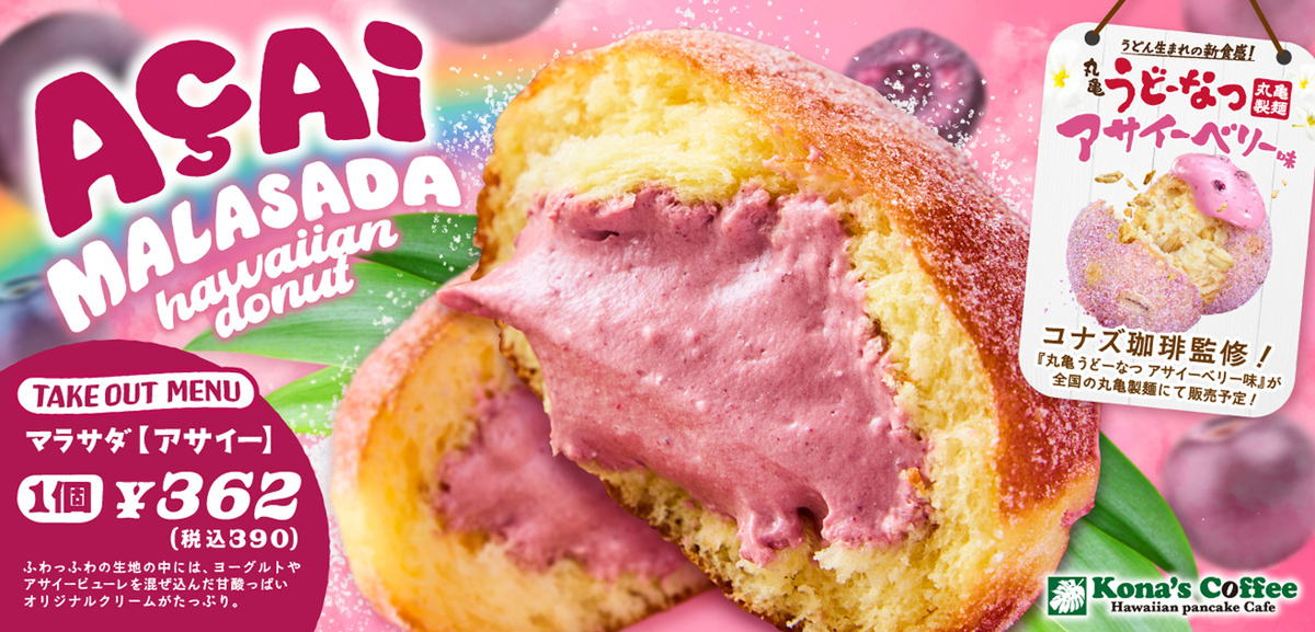 同じく7月17日から、丸亀製麺ではコナズ珈琲が監修した「丸亀うどーなつ アサイーベリー味」を販売します。