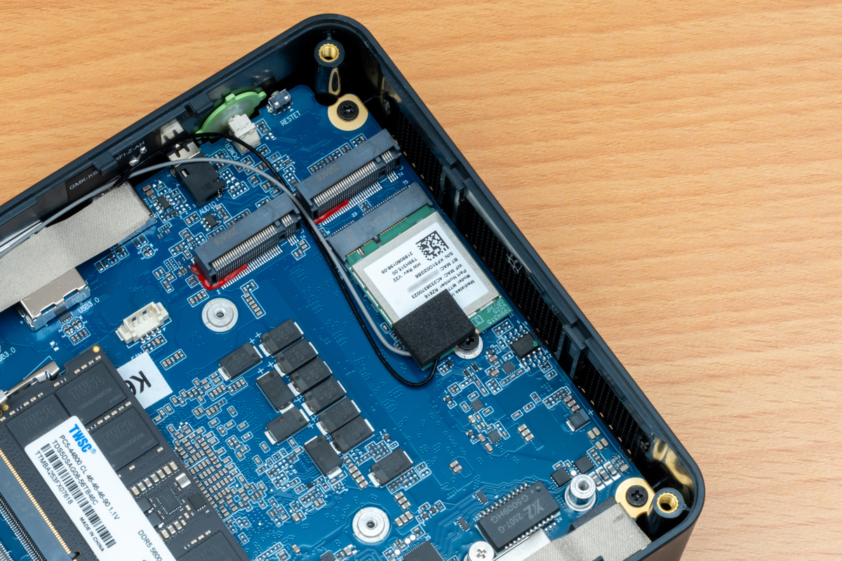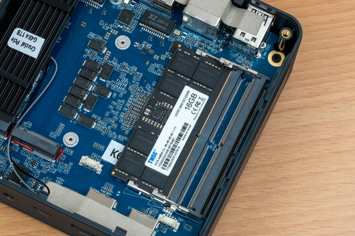 2つのパネルを外せば、メモリースロットとM.2拡張スロットを確認できるようになる。メモリーは国内で単体入手が難しい、中国 深センにあるTWSCというメーカーのモジュールだった。メモリーチップの刻印はTWSCで、製品シールからDDR5-5600 CL46-46-46-90 1.1Vと確認できた。