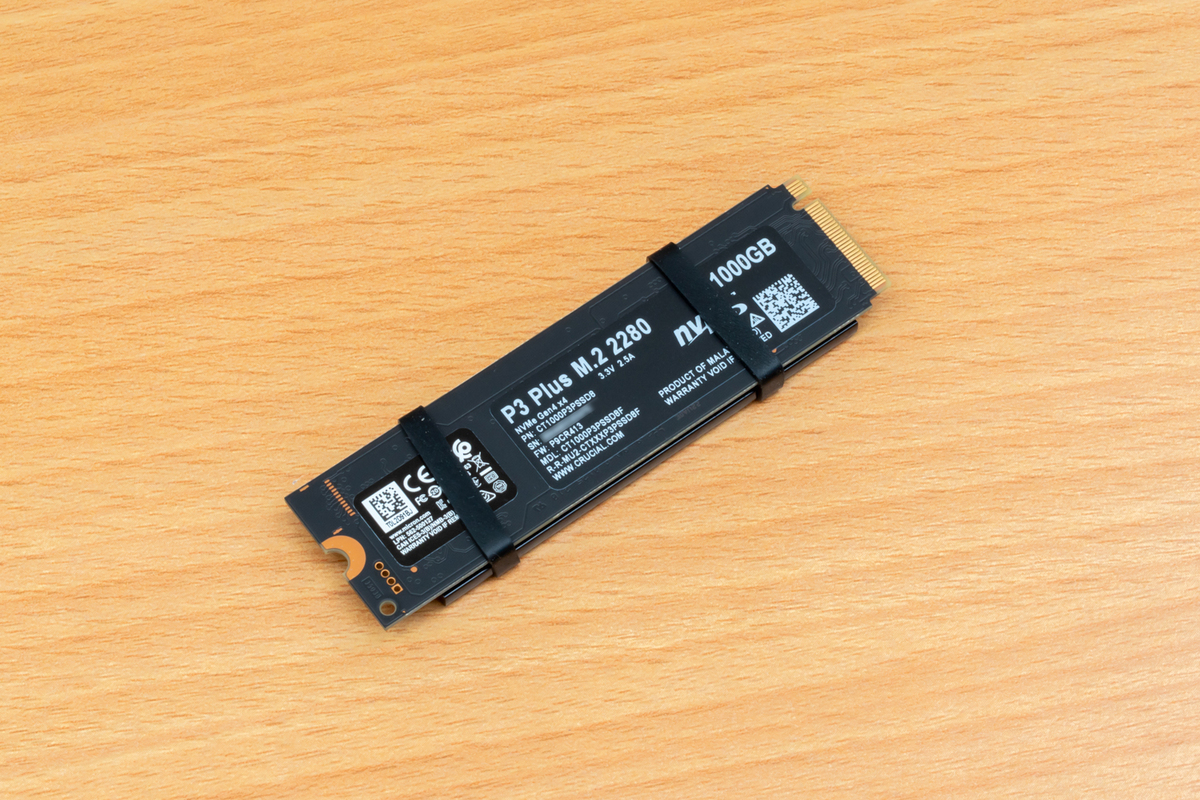 搭載SSDを確認すると、読み出し速度5000MB/秒、書き込み速度3600MB/秒を発揮するエントリーPCIe4.0×4 SSD「Crucial P3 Plus NVMe SSD」の1TBモデルだった。