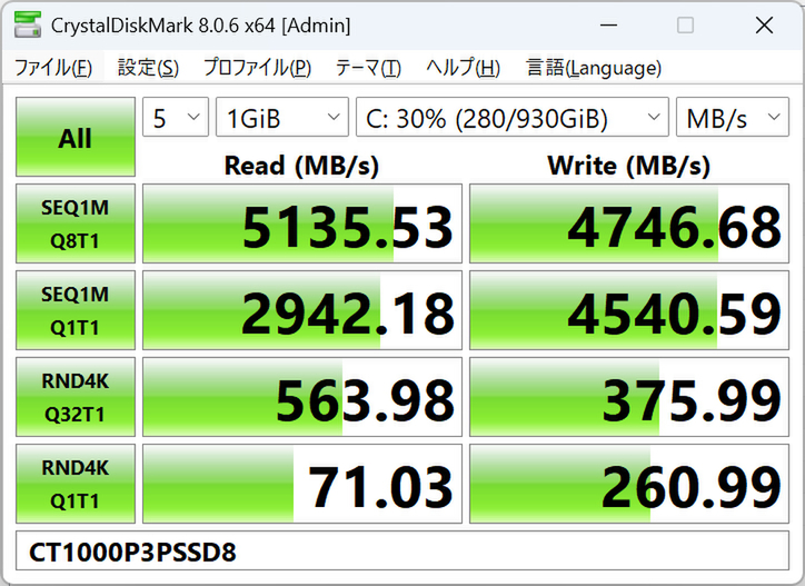 SSDの容量を30%ほど使用した状態で、ストレージベンチマーク「CrystalDiskMark 8.0.6」を実行すると、Crucialのスペック値を超える結果を発揮していた。これなら不満を感じることはないだろう。