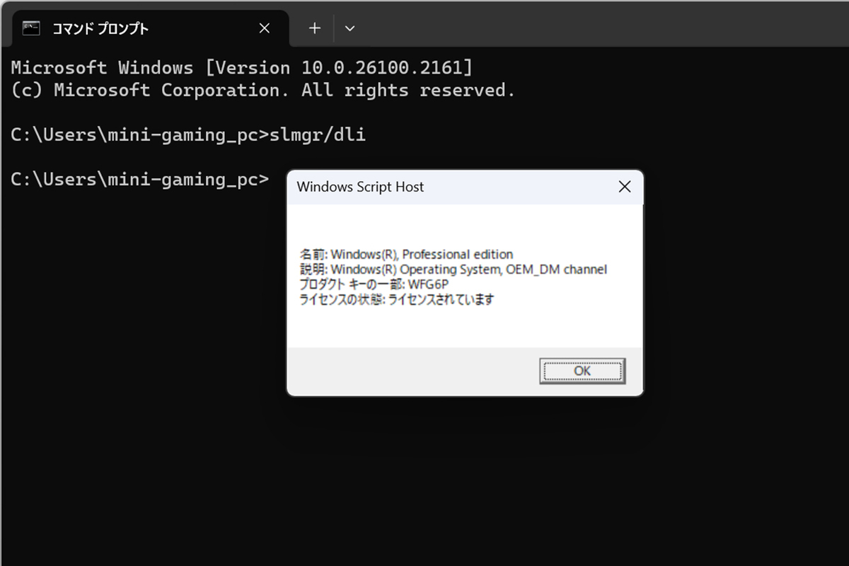 コマンドプロンプトで「slmgr/dli」を実行すればOSのライセンスを確認できる。企業など、組織内で使用するために提供されているボリュームラインセス(VOLUME_M