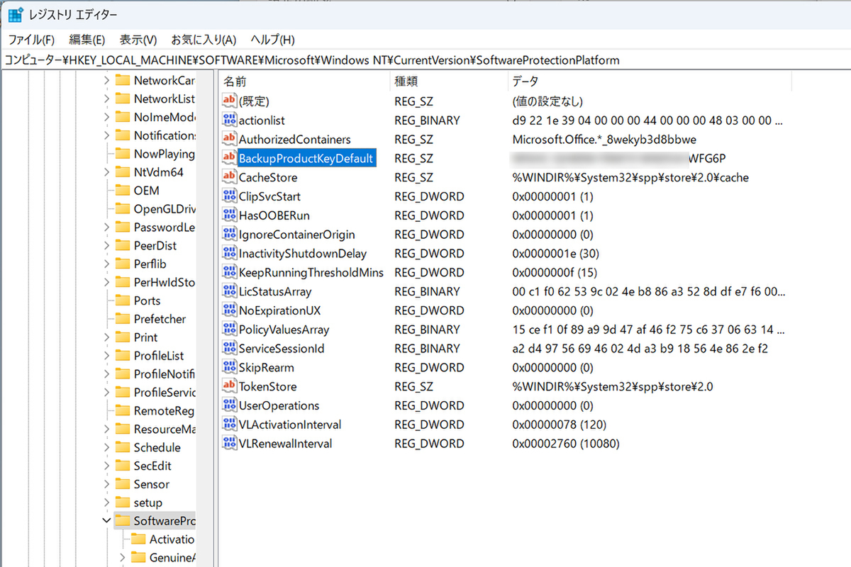 「\HKEY_LOCAL_MACHINE\SOFTWARE\Microsoft\Windows NT\Current Version\SoftwareProtectionPlatform\」の「BackupProductKeyDefault\」を確認しよう。