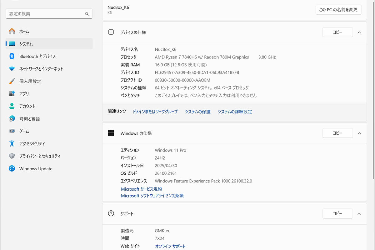 「Nucbox K6」のプリインストールOSは、Windows 11 Proになる。世界で販売展開しているGMKtecなので心配はしていなかったが、念のため中華ブランドの不安要素としてあげられることのあるOSライセンスを確認した。