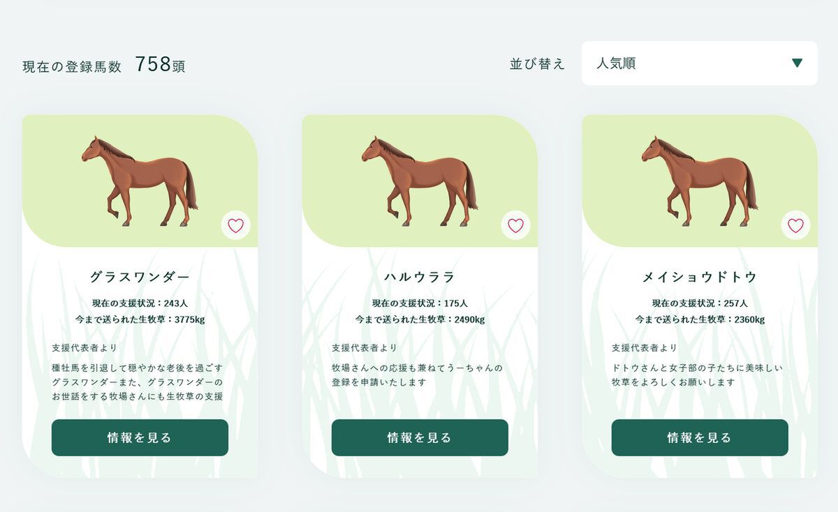 このサイトでは、馬が食べる生牧草をユーザーが贈ることができる(1箱6000円)。ゲームで活躍したウマ娘のモデルとなった馬が存命であることを知り、「推し」を応援するような感覚で利用するトレーナーが増えたのかもしれない。
