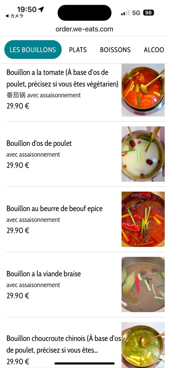 店員さんに案内された席に着くと、スマートフォンからQRコードを読み込んでオーダーする形式とのこと。アクセスしてみると、火鍋用のスープの選択と、ドリンクや火鍋以外の一品料理はここからオーダーします。火鍋自体の料金は食べ放題で29.9ユーロ(約5154円)でした。