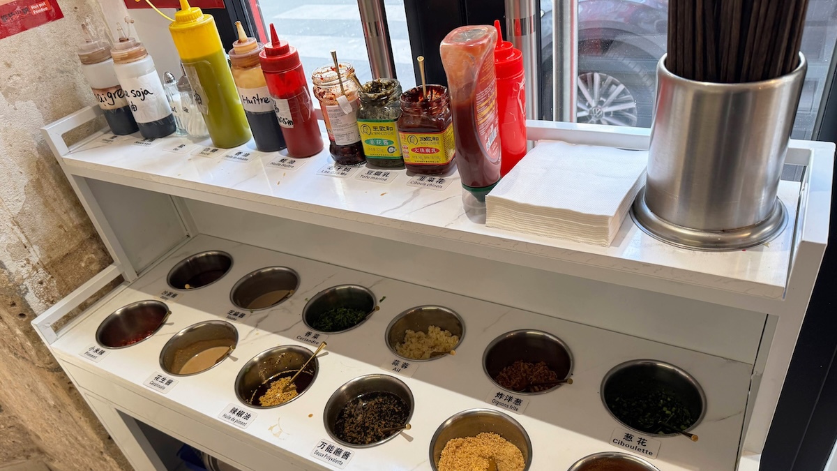 タレなどは別カウンターに用意されています。中華系の醤油ベースのタレのほか、ニンニクやパクチーなど定番の素材も用意されていて、自分好みのアレンジができるのがうれしい。