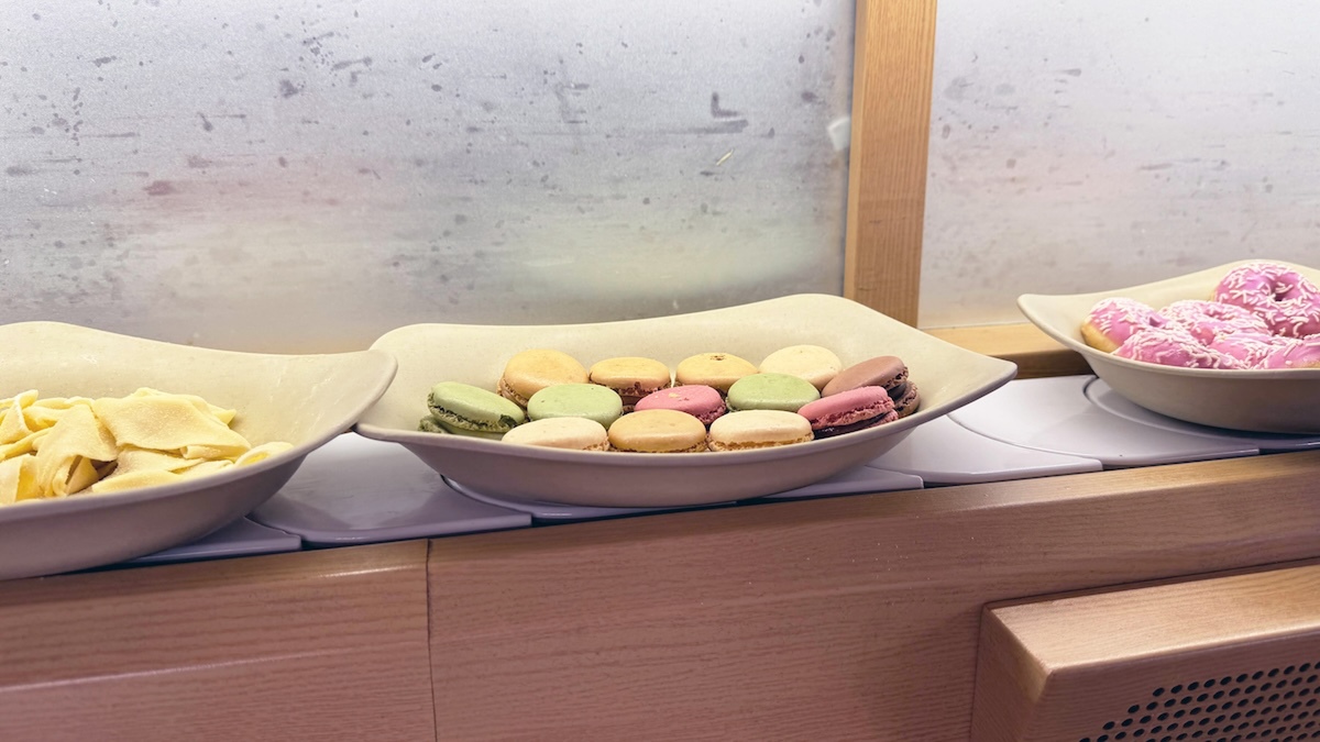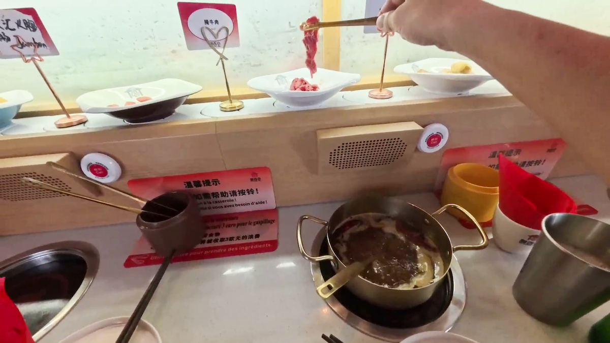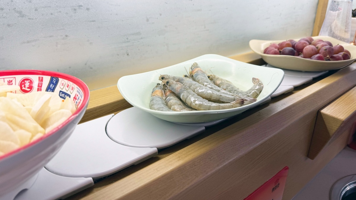 牛・鶏・羊などの肉のほか、エビや貝類、フィッシュボールなどのシーフード、そしてもやしやレタス・白菜などの野菜もちゃんと回ってきます。デザートも同じく回っているのですが、マカロンがあるところにフランスらしさを感じました。