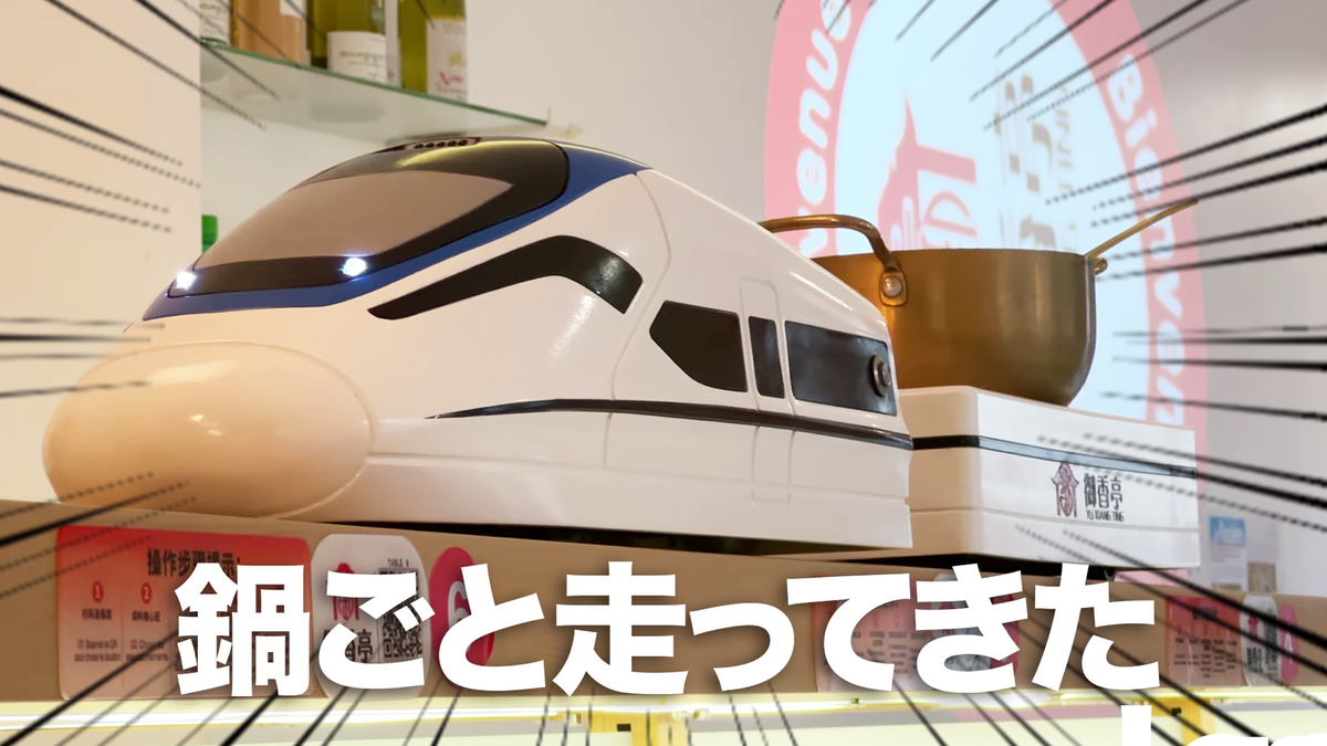 タレを作って席に戻ると、隣のお客さんに「鍋が来てるよ」と話しかけられました。ふとカウンターを見上げると、中国新幹線(の模型)が停まっていて、後の車両には鍋が積み込まれていました! 鍋や一品料理は中国新幹線が運んでくれるようです。日本の寿司チェーン店でも見かけますが、海外でしかもパリで遭遇するとは思わなかったので、ちょっとビックリです。