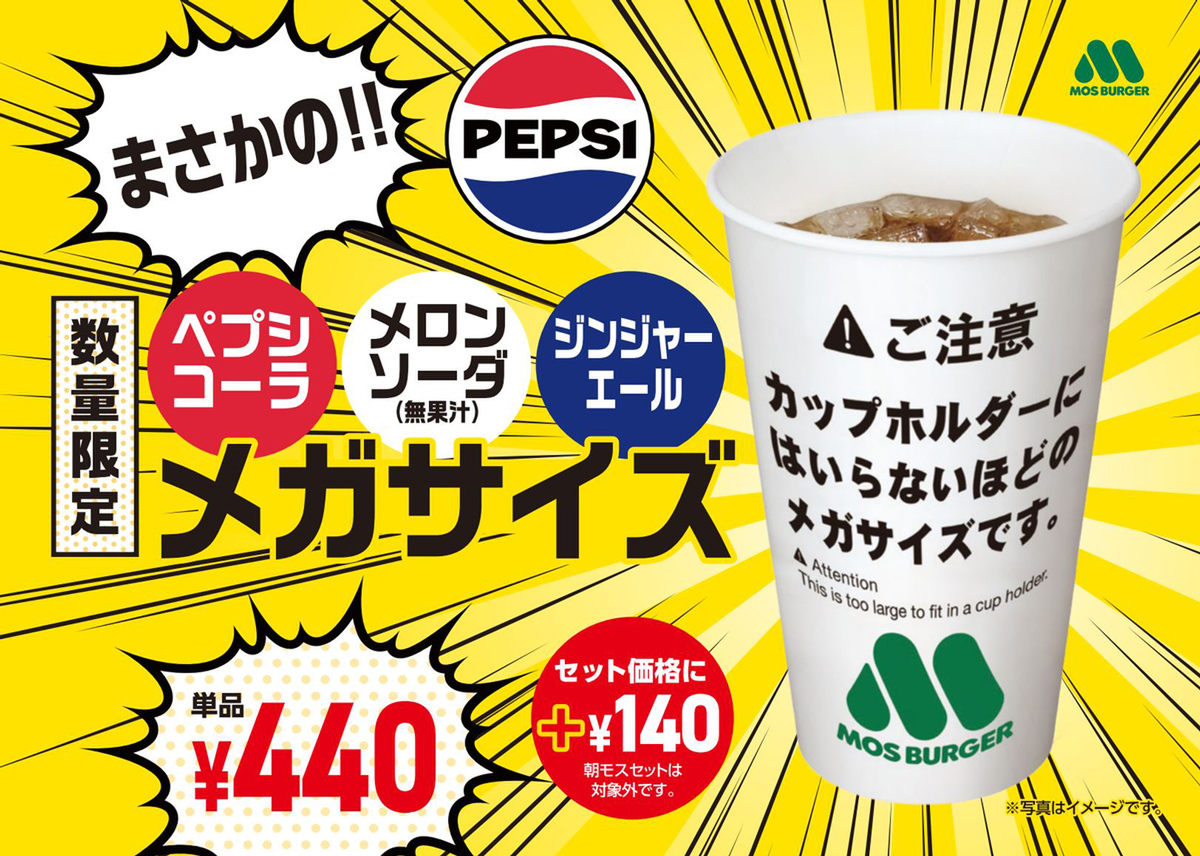 モスバーガーは7月16日から、全国の店舗(一部店舗を除く)で「ペプシコーラ」「メロンソーダ(無果汁)」「ジンジャーエール」のメガサイズを数量限定で発売します。