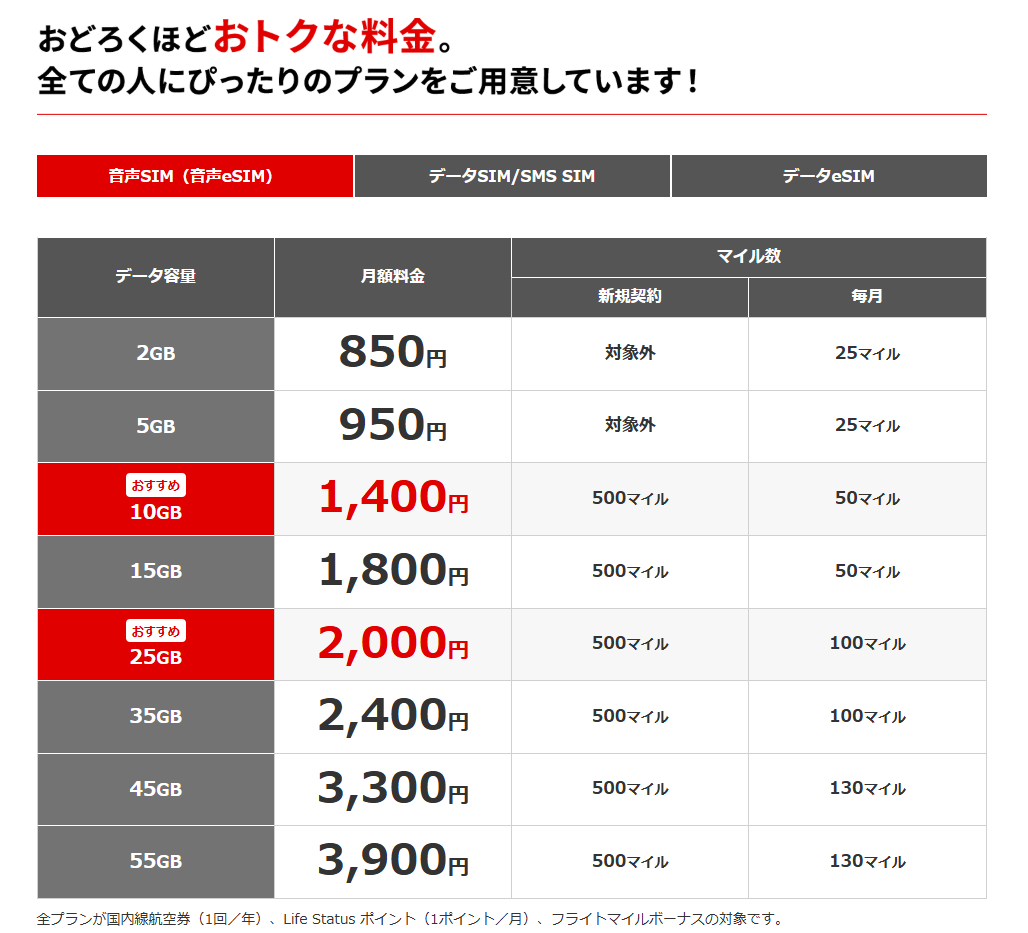マイルがいっぱいもらえる 年に1回航空券が実質無料の格安SIM【JAL専用】