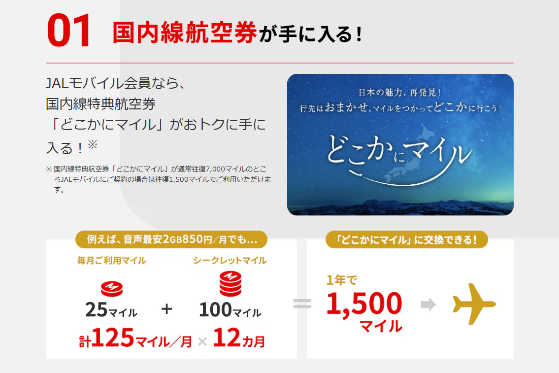 まず、新規またはMNPで契約すると、加入プランに応じて最大1000マイルが付与。さらに契約から3ヵ月後には、国内線往復航空券と交換できる「どこかにマイル」用1500マイルクーポンがもらえます(その後は年に1回)。