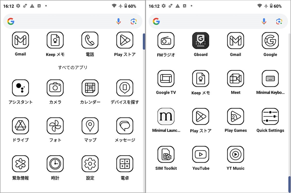 Minimal Phoneは2つのUIが選択できる。1つはホーム画面にアプリアイコンではなく、7個のアプリが文字で表示されるモード。日本語にも対応しており、シンプルな使い勝手を提供する。なお、このモードからもアプリの起動は可能だ。