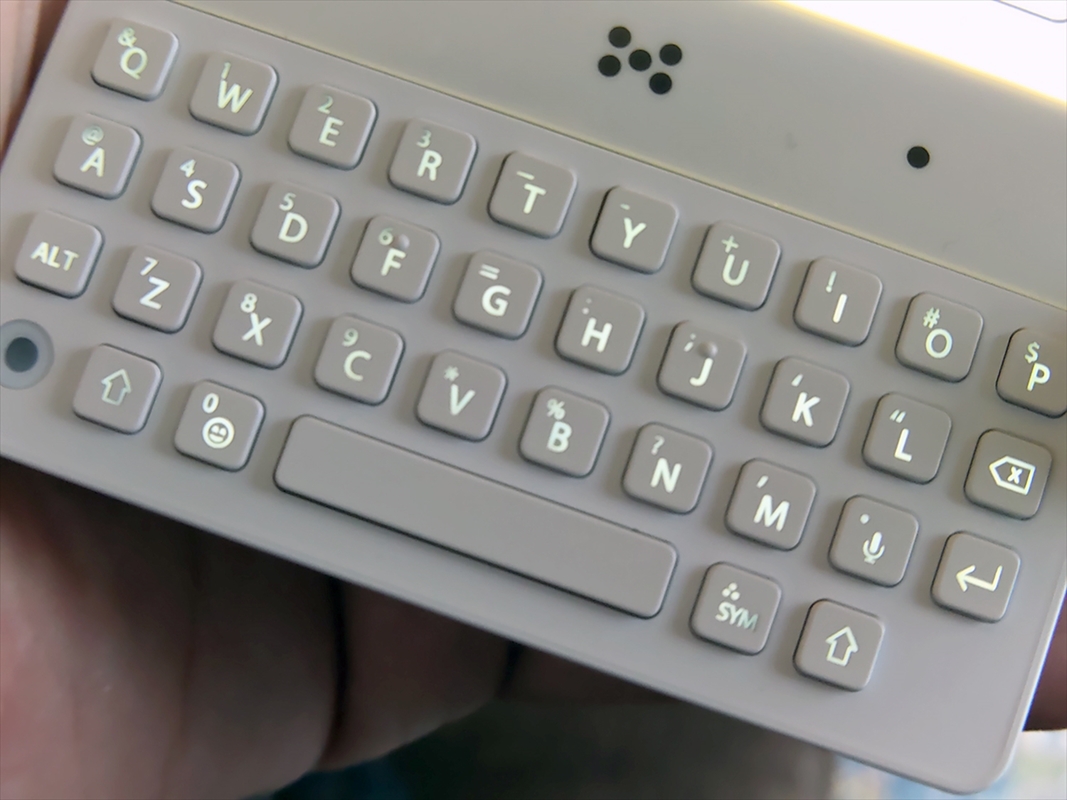 キーボードは1つ1つが独立しており、キーとキーの間に隙間がある。そのため、BlackBerry端末のように指先をキーボードの上で滑らすように入力していくというよりも、親指を使って目的のキーを1つ1つ押していく、といった感覚で入力する。キーを押すときにぐらつきはなく、キーストロークもあまり深くない。初期出荷モデルでは日本語入力に難点があったが、最新モデルではGboardを使った日本語入力も可能になった。