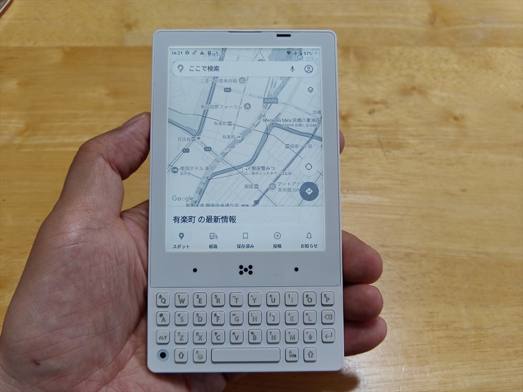 テキストの表示はディスプレー解像度が230ppiと低いものの、バックライトを使わない電子ペーパーの特性もあってしっかりと見やすく表示される。一方、グラフィックはカラー部分が淡い色合いとなるため、全体的にややぼんやりとした表示になる。これはグーグルマップの表示だが、全体的に薄い表示になっている。
