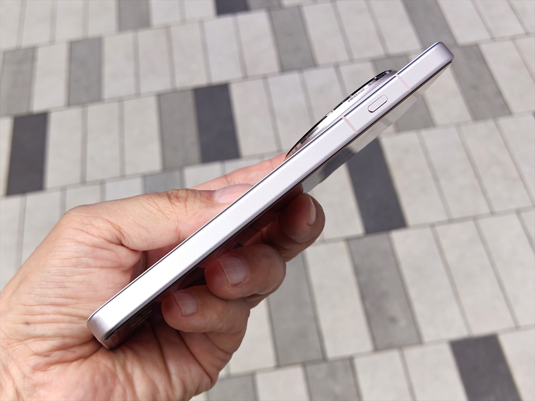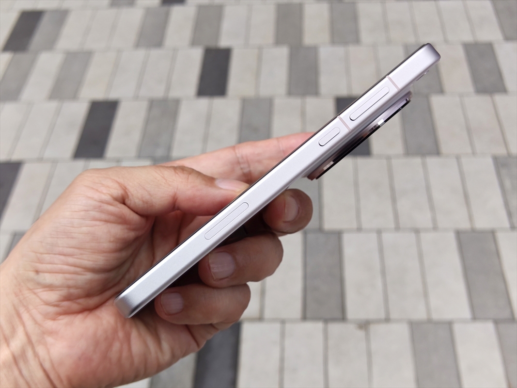 本体の右側面には電源ボタン、ボリュームボタン、さらにカメラ操作用のクイックボタンも備えている。クイックボタンはボタン上部を指先でスライドさせる操作にも対応している。本体サイズは約76.8×163.09×8.78mm、重さは226gだ。