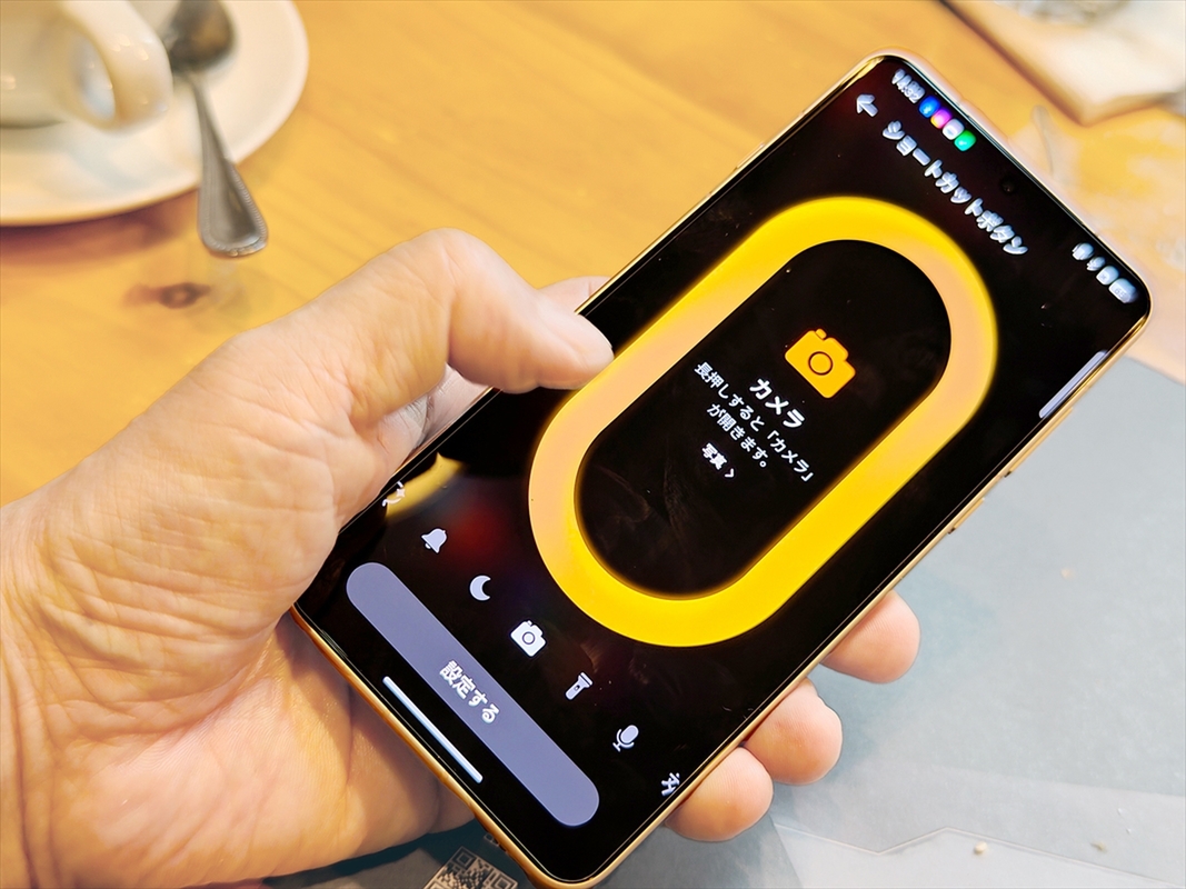 ショートカットボタンのカスタマイズは設定メニューからできる。割り当てられる機能はアラートスライダー同様にマナーモード、カメラ、AIアシスタント、フラッシュライト点灯など。それぞれの機能は画面に大きく内容が表示されるため、初めてこの機能を使うユーザーでも用途がわかりやすい。