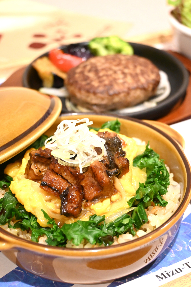 注目メニューは「うなぎ&アンガスステーキのピラフ仕立て」。鹿児島県産のうなぎ蒲焼に、米国産アンガスステーキを合わせた贅沢なひと皿です。ピラフは、バターライスをベースに、オリジナルの赤ワインソースとケールで仕上げられており、さらに赤ワインソースを後がけ。