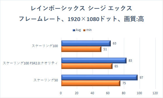 次は軽量級タクティカルチームシューターで、6月から無料で楽しめるようになった「レインボーシックス シージ エックス」で確かめてみた。解像度は1920×1080ドット固定で、画質はプリセット「高」をベースに、レンダリングスケールやアップスケーリングを設定した。