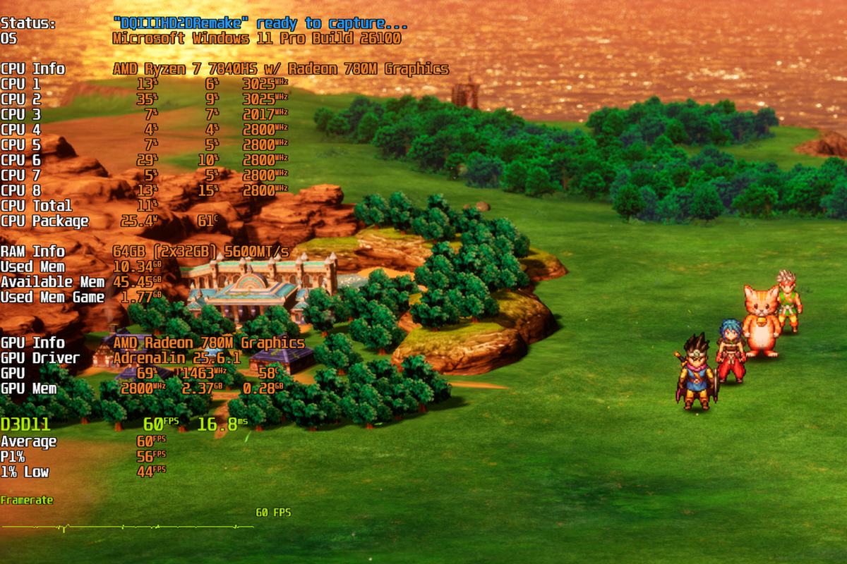 続いては、HD-2D版「ドラゴンクエスト III そして伝説へ…」をプレイしてみた。画質を最も高い設定にすると、解像度を1920×1080ドットにする必要があったが、40~60fpsでスムーズに楽しめた。