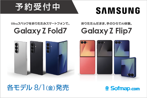 ソフマップは7月17日、折りたたみSIMフリースマートフォン『Galaxy Z Fold 7』と『Galaxy Z Flip 7』の予約受付を開始した。両モデルは8月1日に発売される予定だ。