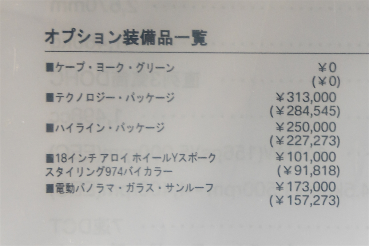 こちらが、今回紹介する車両のメーカーオプションリストです。オプション総額は83万7000円です。