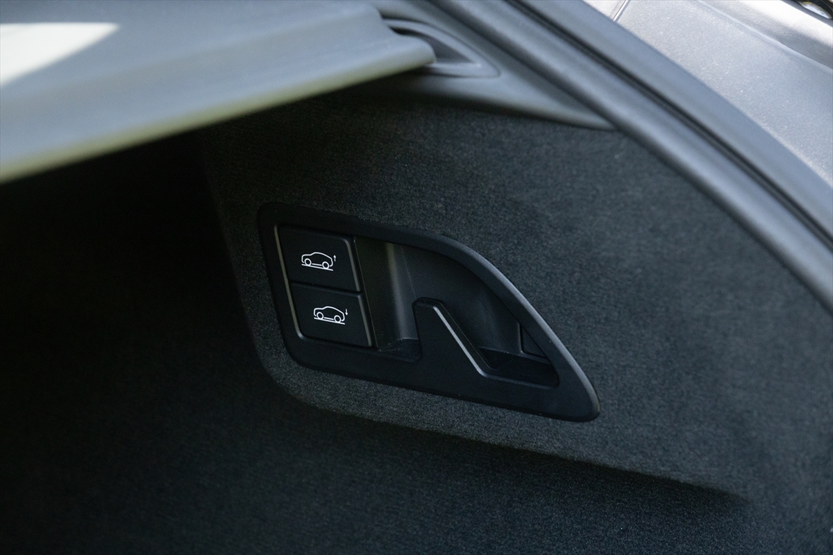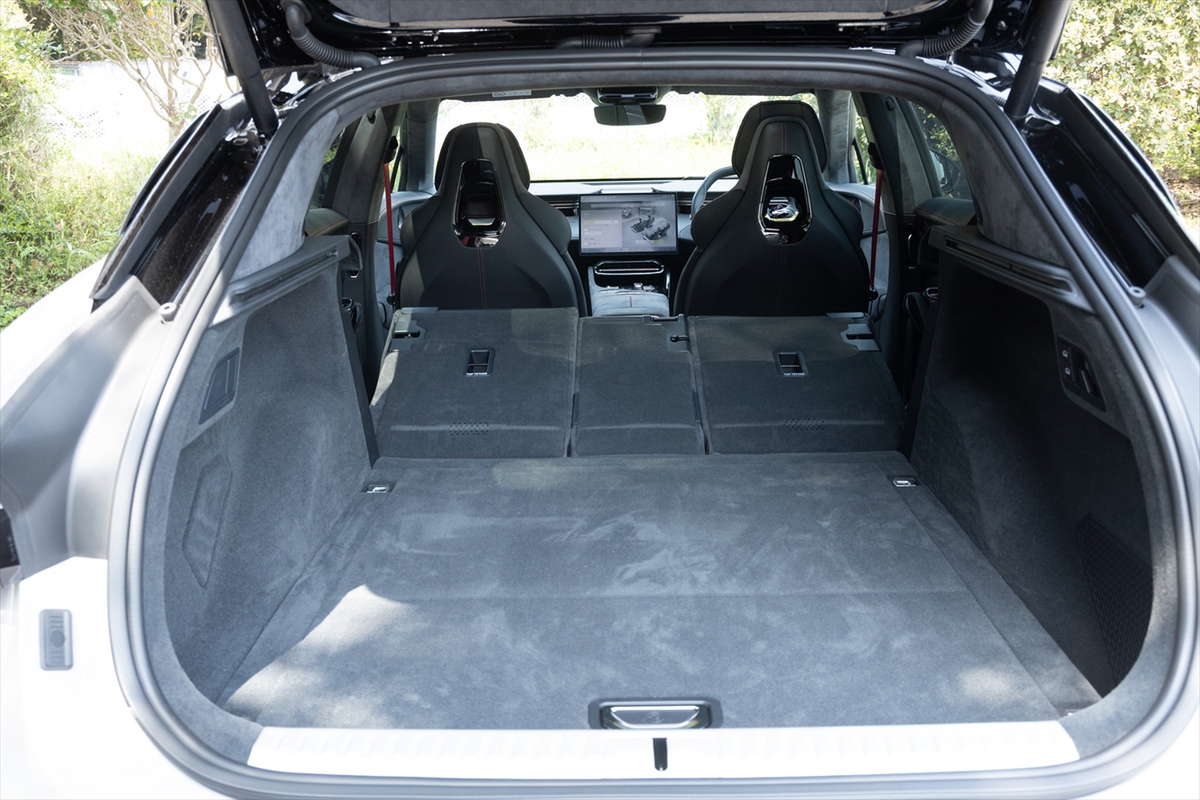 バックドアを開けて荷室をチェック。大型SUVらしく、後席を使う状態で688L、後席を倒すと1532Lと桁違いの容量を誇る。大きな荷物が出し入れしやすいよう、ハンズフリードアのほか、後輪だけ車高を下げる機能も用意される。アメニティーの面でもポータブル電源の充電に便利な12Vのアクセサリーソケットも用意する。