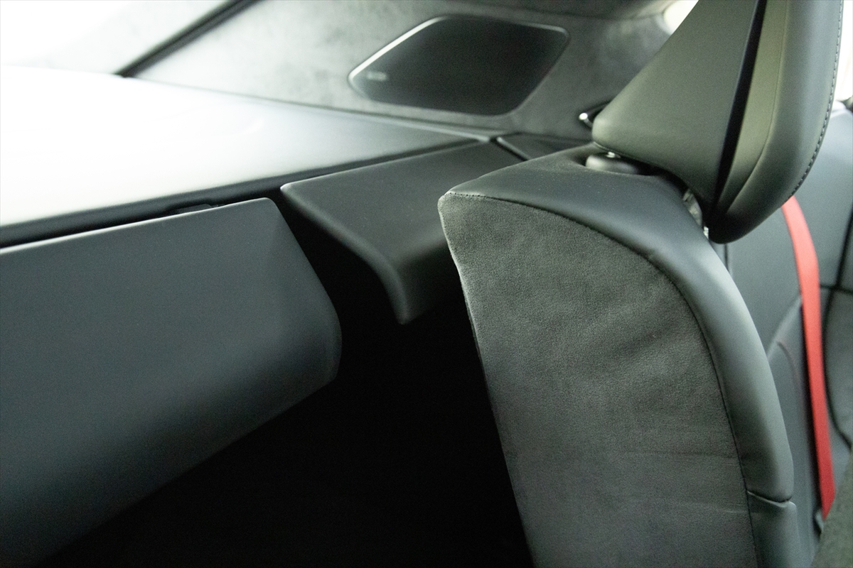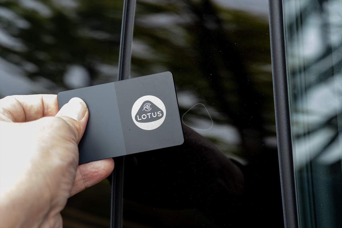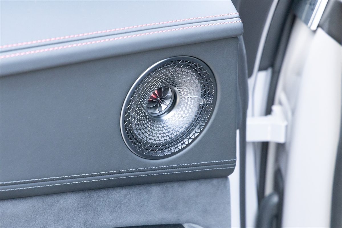 ドアを見て気づいたのが、前席だけでなく後席も遮音性に効果の高い貼り合わせガラスを採用していた。そして英国KEFの同軸ユニットが目に飛び込んできた。KEFは60年以上にわたりホームエンターテインメントでは知られた存在だが、カーオーディオは初。ラグジュアリー初のロータスと相まって初物同士の組合せだ。