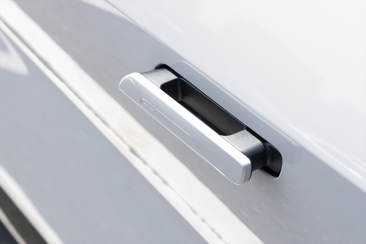 ドアを開けるには、専用のカードキーをBピラーに当てる、または“おむすび型”のワイヤレスキーを近づけると、ドアノブが飛び出してくる。