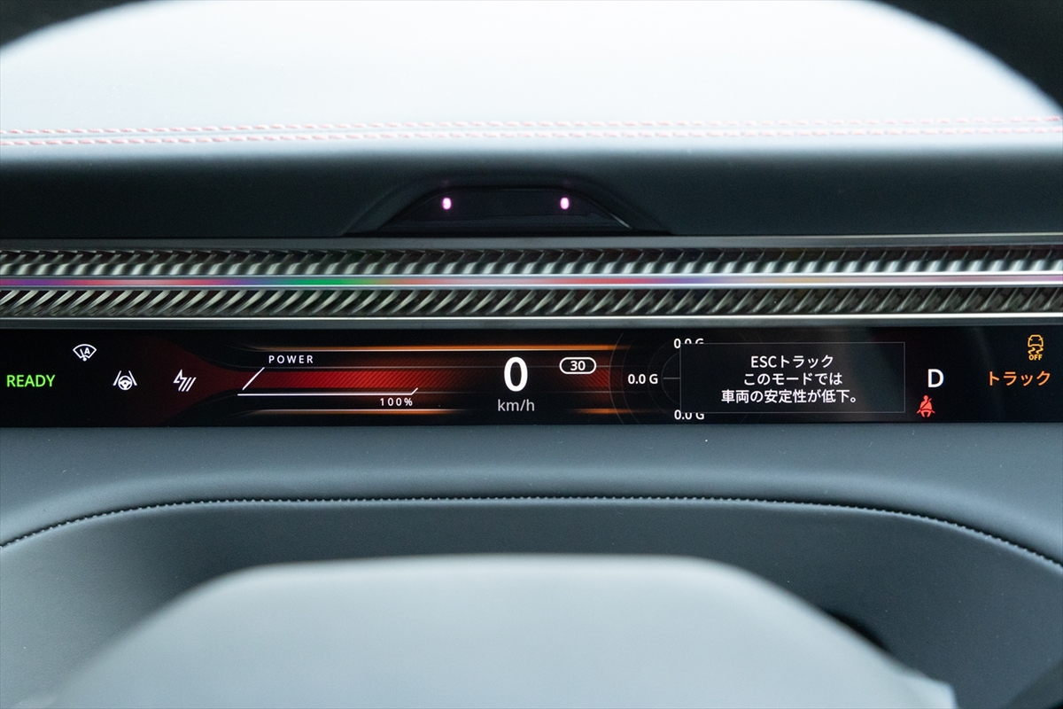 走行モードは数多く、エレトレRにはトラックモードも用意されていた。選択するとESCオフと表示されるほか、残走行距離も一気に減る。さらにスポーツモードとトラックモードではシートのサイドプロテクターが膨らみサポート力がアップする。
