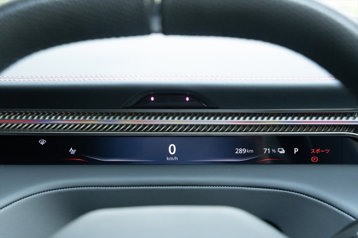 今回取材するエレトレRの車内は、スエード調レザーに赤いステッチというスポーティな雰囲気で満ちている。六角形のステアリングホイールと、巨大なセンターディスプレイが目を引く。ディスプレイは15.1インチの有機ELで輝度が高く明るい場所でも見やすかった。