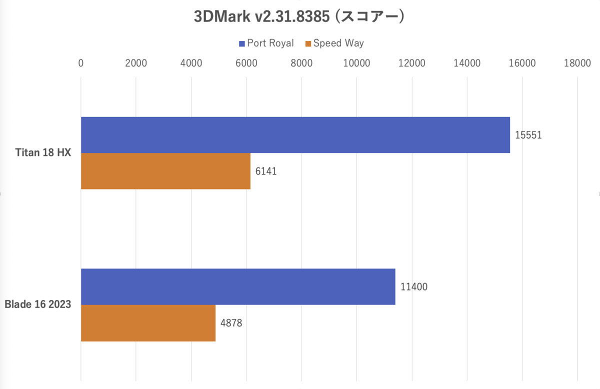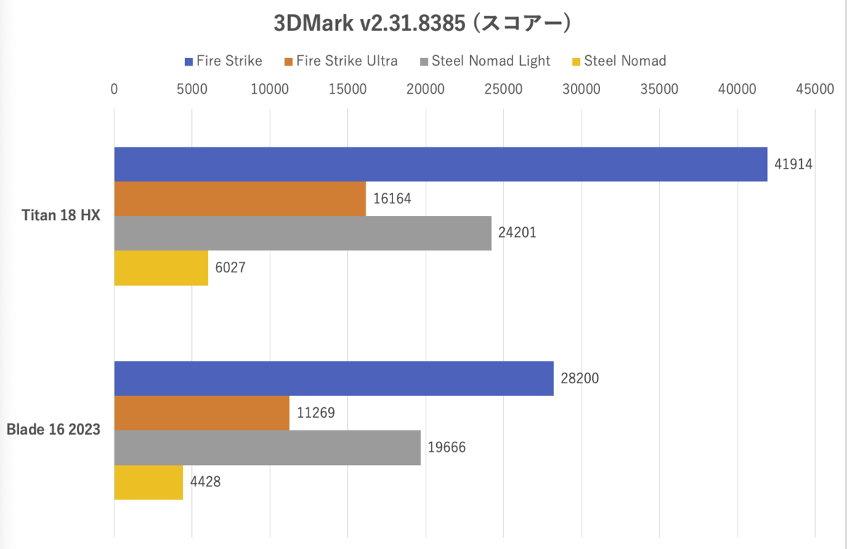 グラフィックのベンチマークなのでGPUの性能がスコアーに強く影響するが、Fire StrikeおよびFire Strike Ultraにおいては、Titan 18 HXはRazer Blade 16 (2023)の43〜49%上の性能だった。