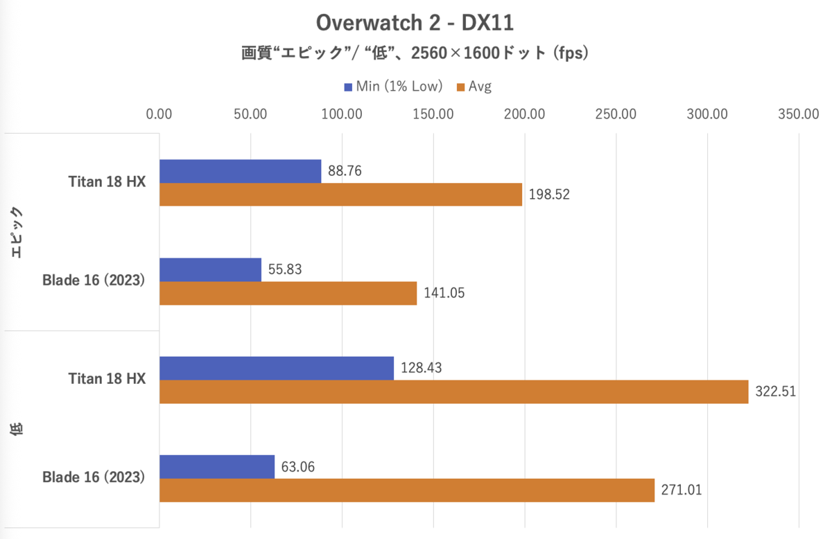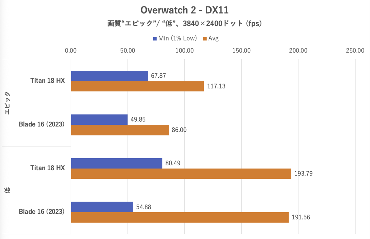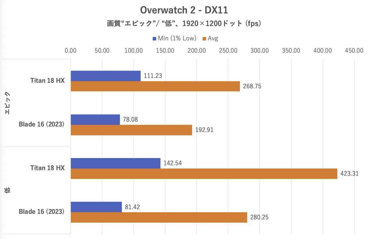 Overwatch 2ではAPIはDirectX 11、画質は「エピック」および「低」に設定したが、どちらもレンダースケール100%に設定。フレームレート上限は600fpsとしている。マップ「Eichenwalde」におけるBotマッチを観戦中のフレームレートを計測した。