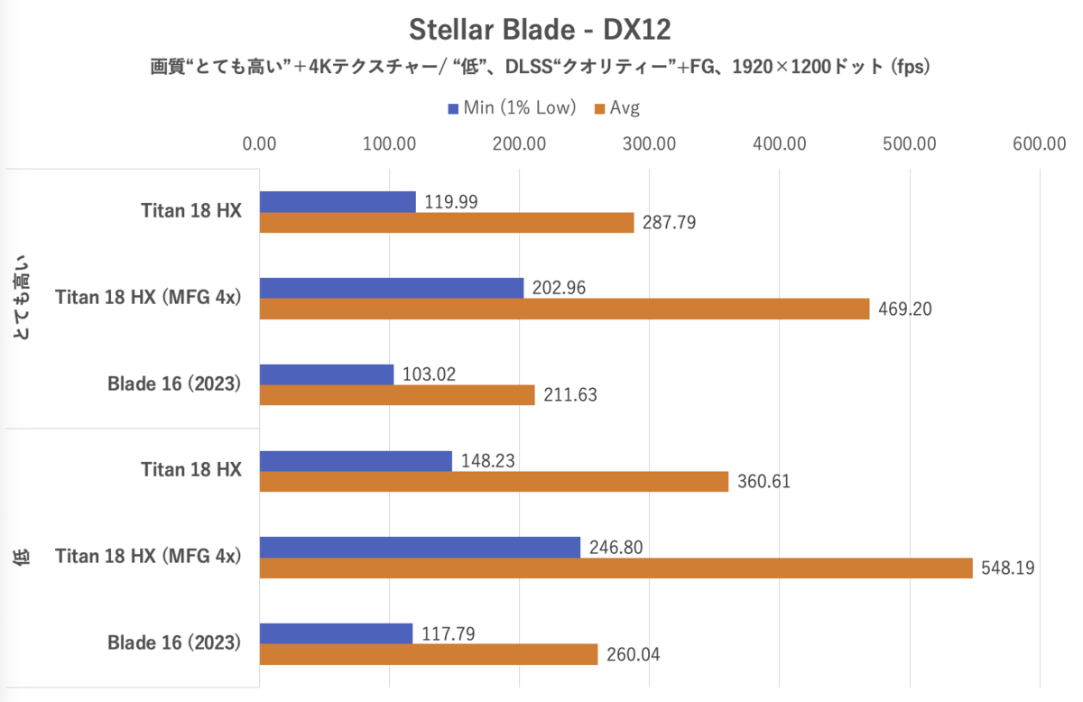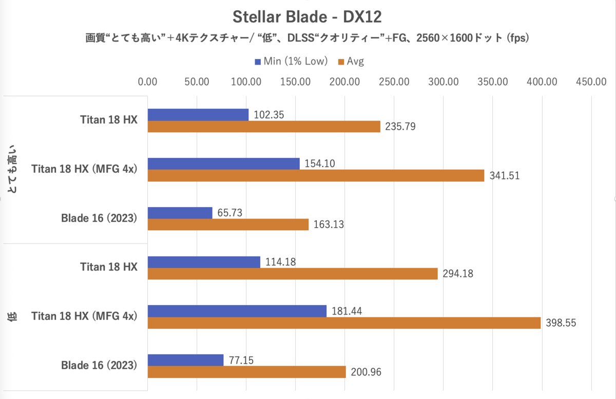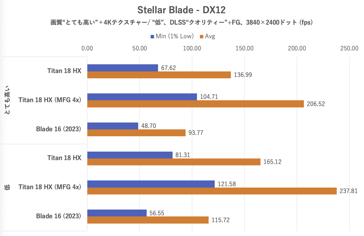 Stellar Bladeでは、画質は「とても高い」および「低」を選択、DLSS(クオリティー)やフレーム生成も有効化。なお、「とても高い」設定時のみ、環境テクスチャーを4K設定にした。最初のステージにおける一定のコースを移動した際のフレームレートを計測。