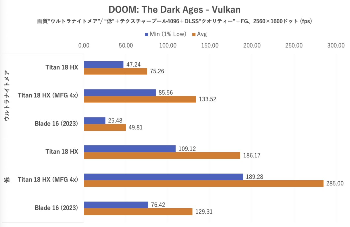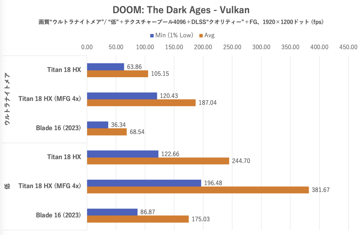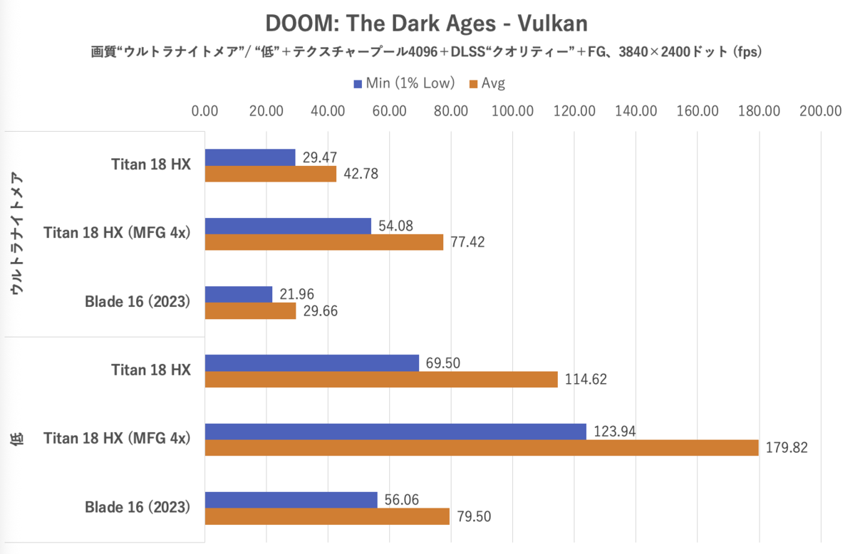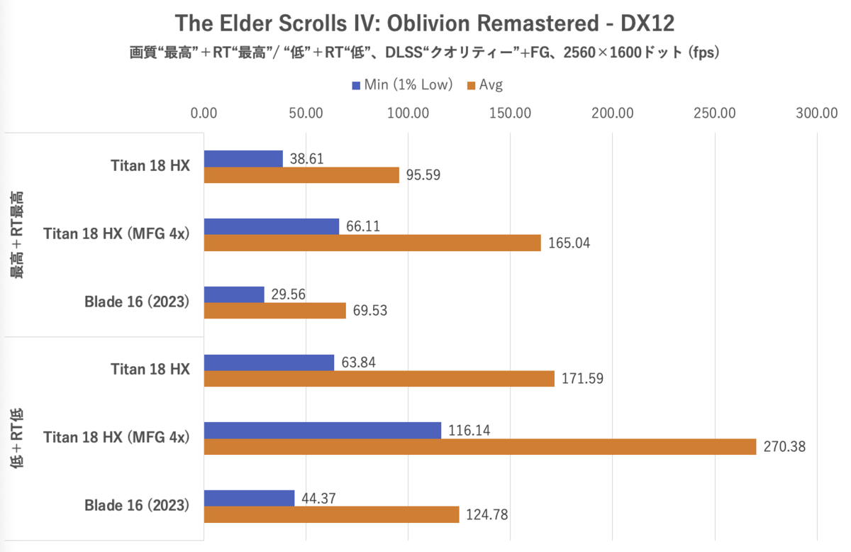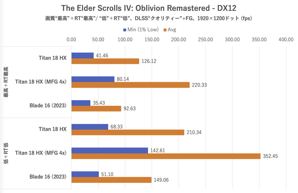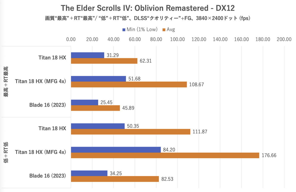 DLSS MFGを利用できるTitan 18 HXの強さが際立つ一方で、DLSS FGだけの状態ではTitan 18 HXでもカクつきが気になる。特にこのゲームはCPU負荷が高く、Razer Blade 16 (2023)はCPUの論理コア数の点で有利になるかと思ったが、ことごとくTitan 18 HXに勝てなかった。