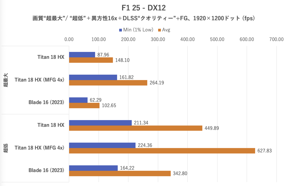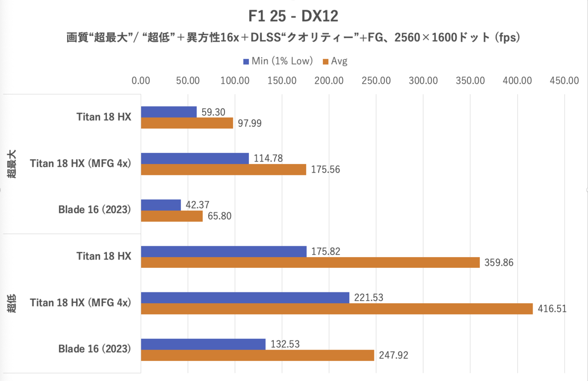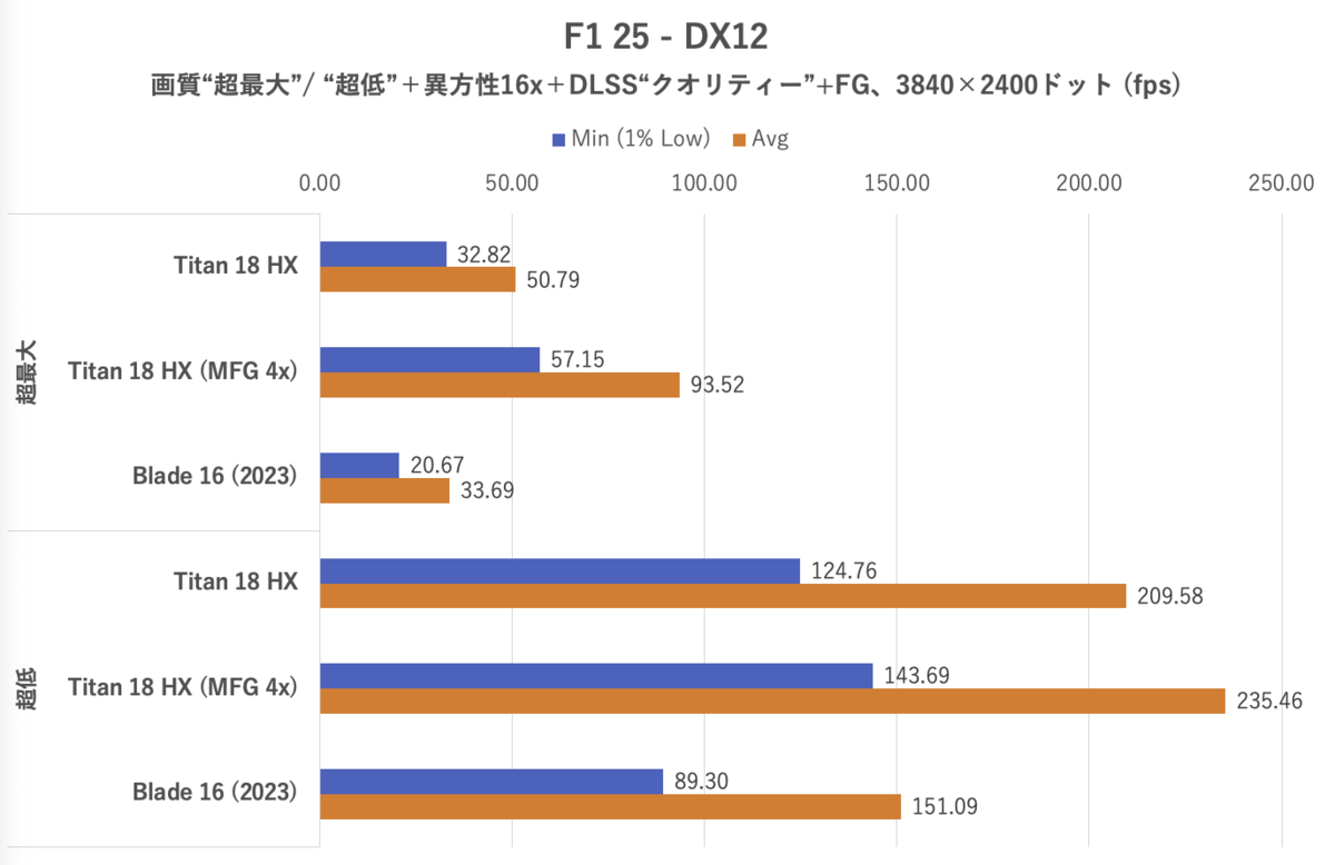 3840×2400ドットになると、Titan 18 HXでもDLSS MFGは不可欠となる。Titan 18 HXでF1 25をプレイする際の画質は、「超最大」ではなく「超高」(パストレーシングはオフ)程度にとどめておきたい。