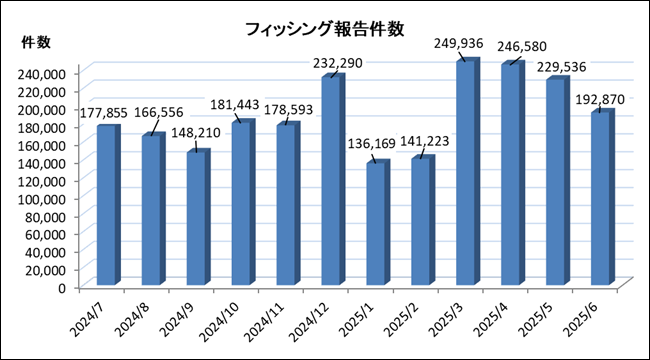 フィッシング対策協議会が7月に発表した2025年6月分の「フィッシング報告状況」によれば、「報告件数」は前月から3万6666件減少して19万2870件になりました。